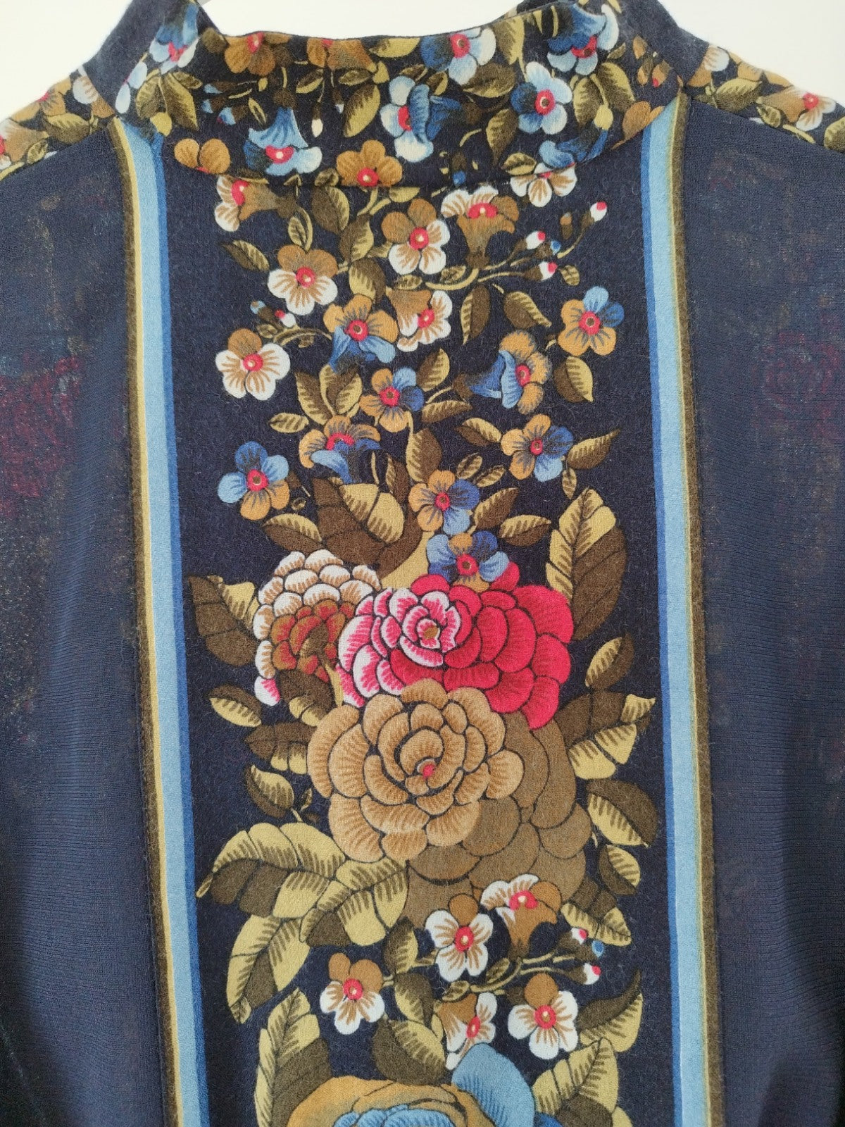 This charming short-sleeved blouse boasts a lovely flower print that's sure to catch the eye. It features a mandarin-style collar and buttons down the front for easy wear. With a flattering gathered waist and matching print on both the front and back, this blouse is the perfect addition to any vintage collector's wardrobe.