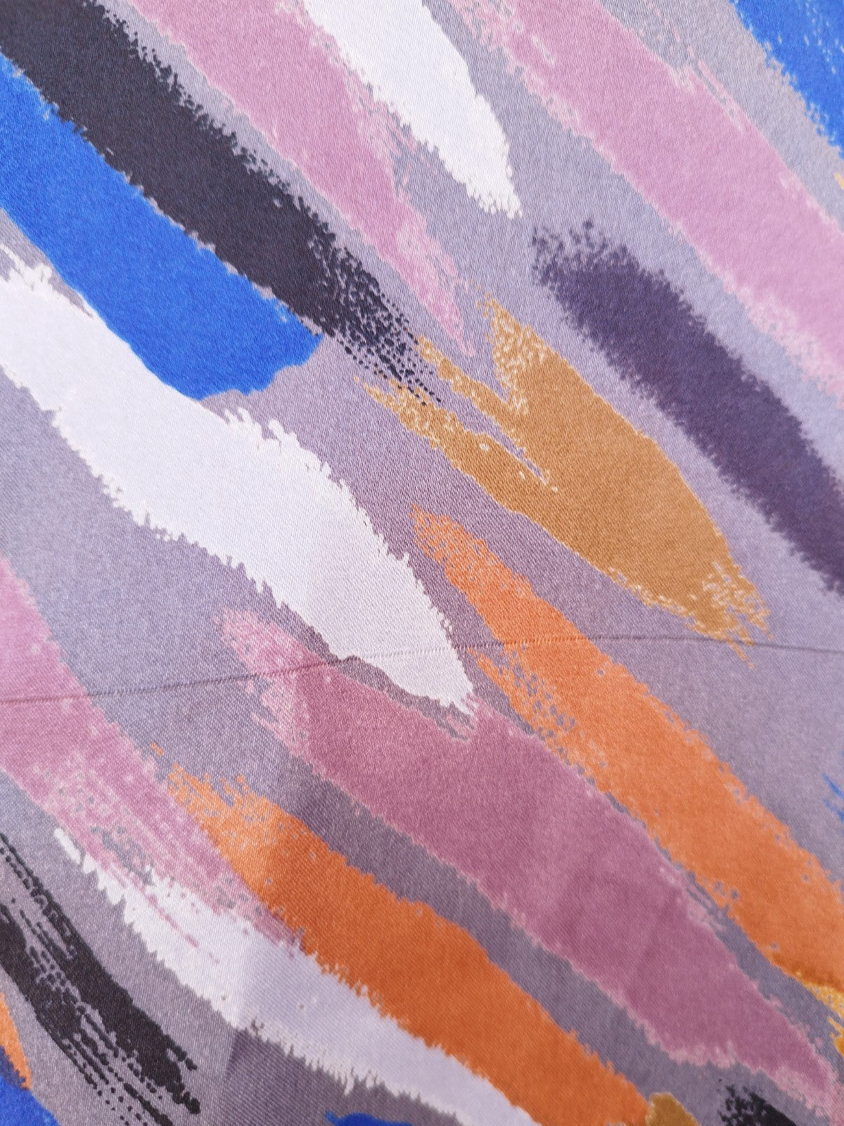 Experience a modern and chic look with this mid-length grey oversized dress featuring an abstract brush stroke print in vibrant hues of orange, blue, black, dusty purple, and off-white. The dress is designed with elbow-length puff sleeves, big shoulder pads, and a pointed collar, which adds a touch of elegance to the look. The body is intentionally loose, but still has a flattering shape with darts at the chest and vertical ones at the front and back. To cinch in the waist, a matching belt is included, which can be tied at your preferred height.