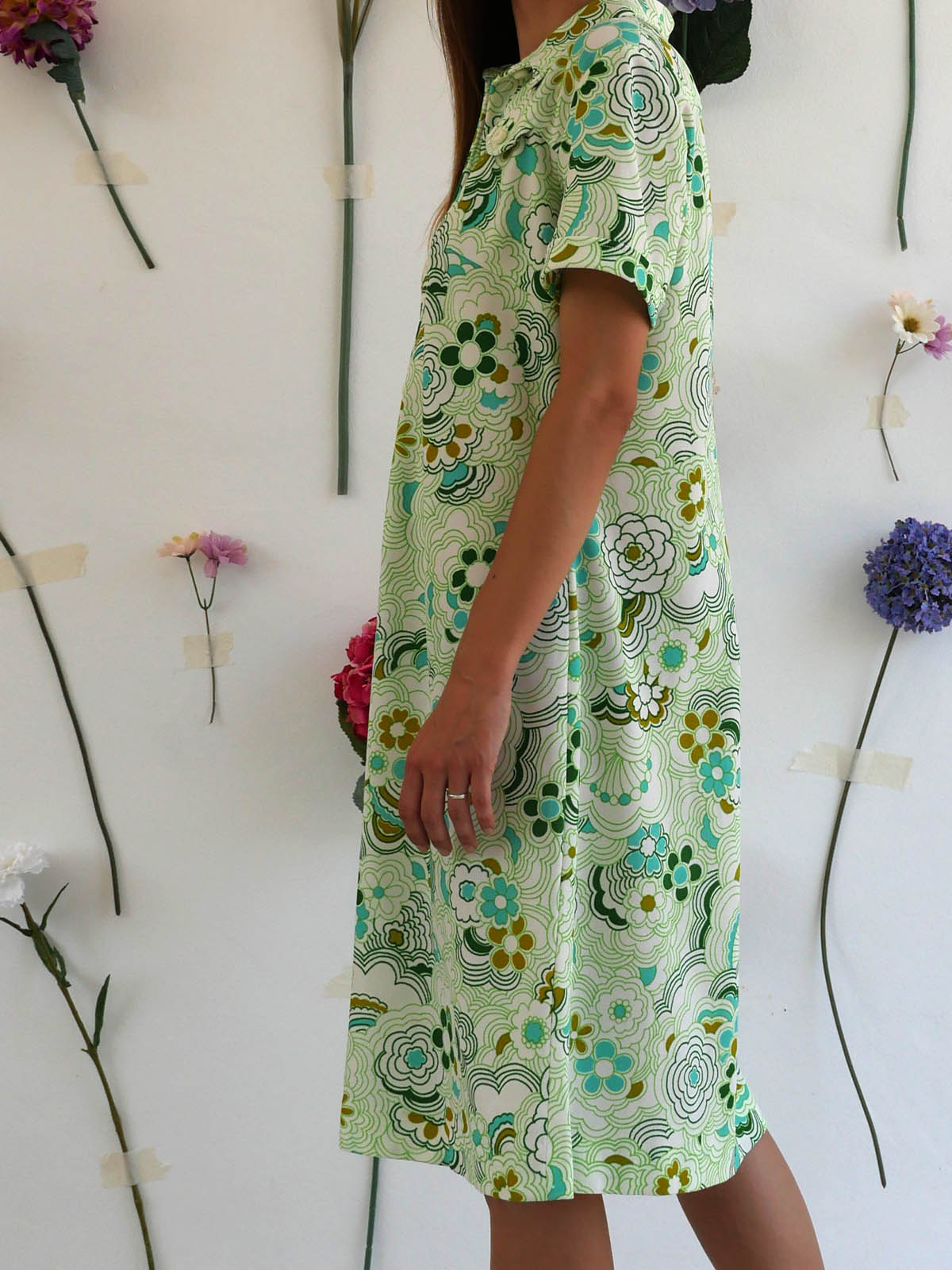 A 60s dress with a vibrant pop flower print in shades of green on a white base. This dress comes with short sleeves, a pointy collar, and faux pocket flaps with buttons on the chest. The front of the dress has functional white shaft buttons. It is designed to fit slimmer figures and reach knee length, but can also work as a short fitted dress for fuller/taller figures.
