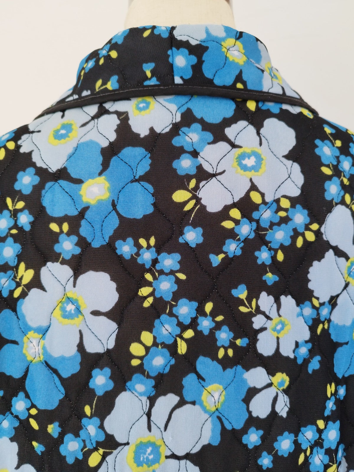 Wrap yourself in timeless elegance with this elegant, yet cool home robe featuring a striking black, blue, and yellow floral print. The modern design includes a small round collar, 7/8 sleeves, and a black hem, making it a perfect blend of vintage and contemporary style. With its quilted construction, black button front, and large pocket, this robe is versatile enough to be worn both indoors and outdoors, making it an ideal addition to your wardrobe.