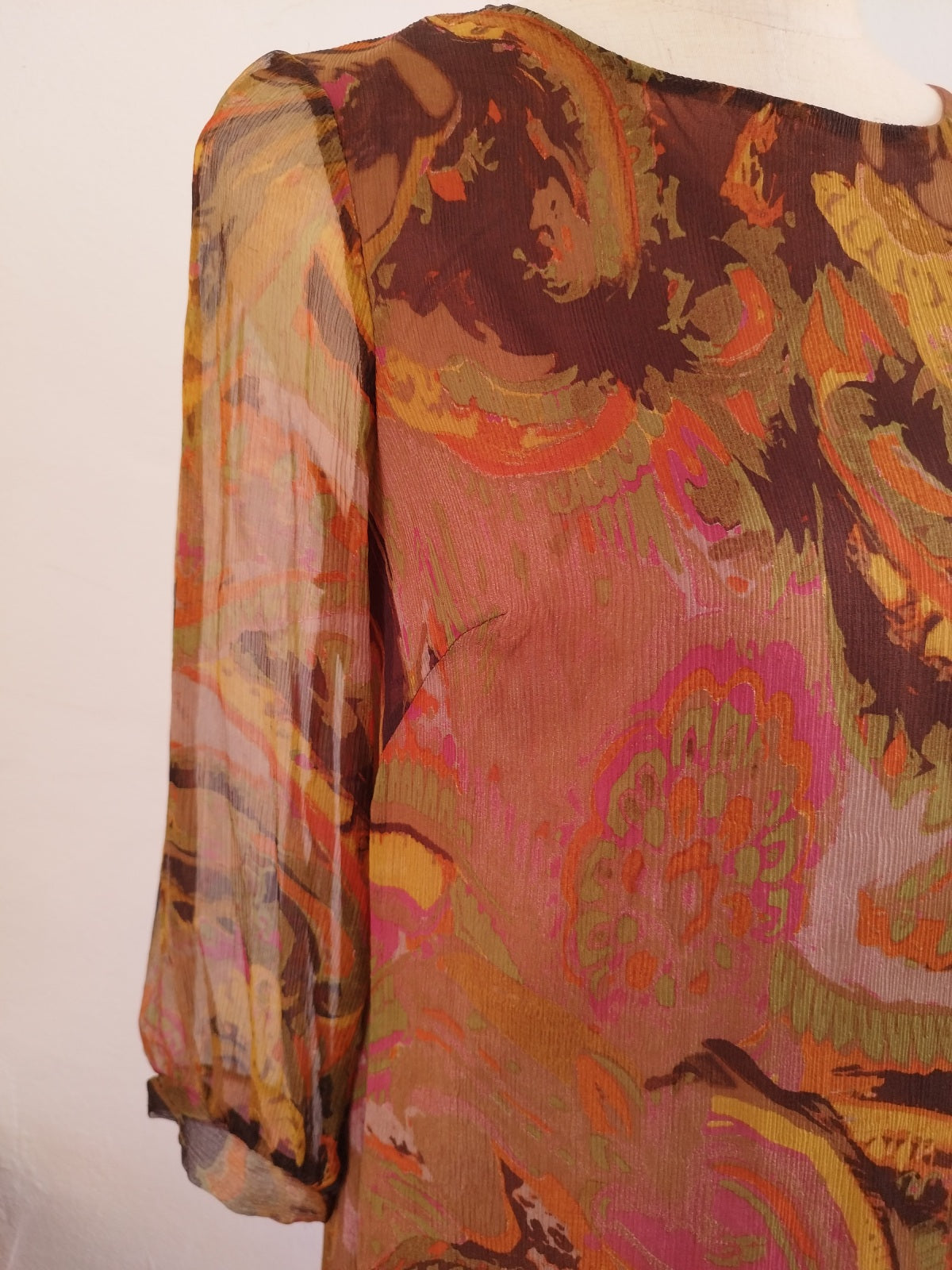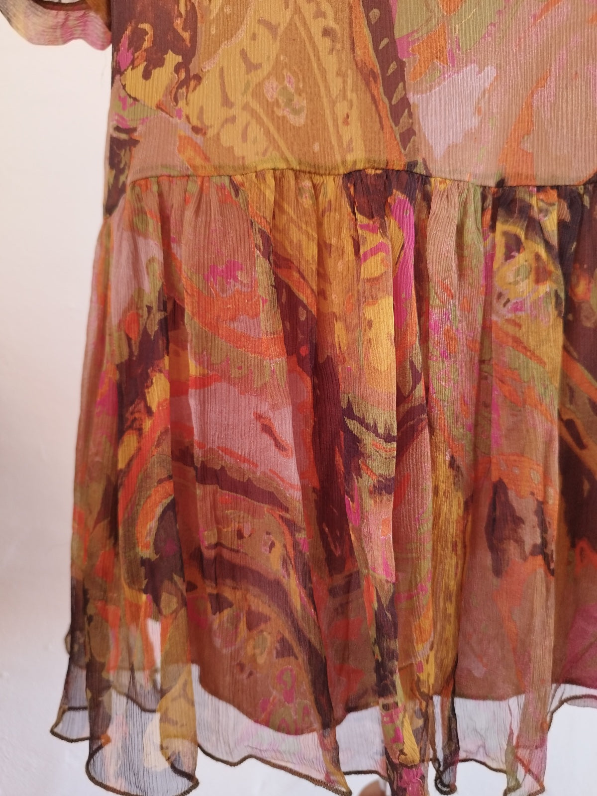 Earthy colored mini dress with a sheer silk outer layer with paisley print. The dropped waistline leads to the ruffled skirt. The body is lined in matching brown material while the 3/4 puff sleeves are unlined for a transparent look. The dress is secured with a hook-and-eye closure at the back of the neck.