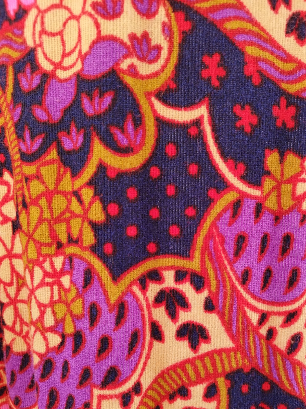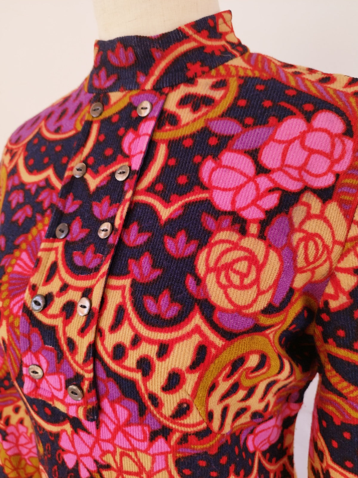 Experience the unique glamour of the 60s with this stunning long dress. The wool-like material with knitted texture is adorned with a bold floral print that is sure to turn heads. The high neck and front panel with shimmery buttons give it an unmistakable vintage look. The slim sleeves add a touch of elegance and end with three buttons on each arm. A long zipper on the back makes it easy to slip on and off.